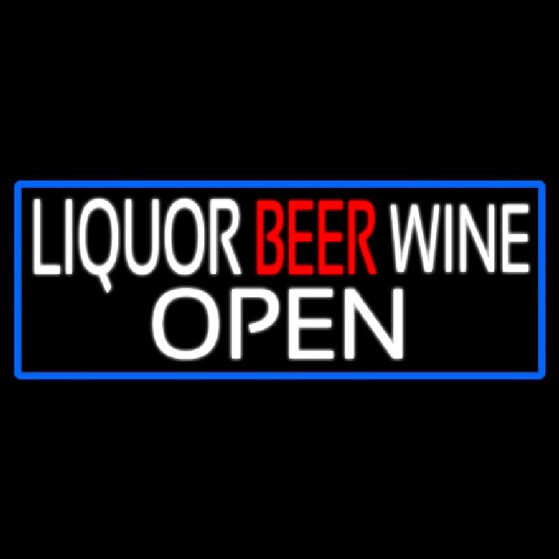 Liquor Beer Wine Open With Blue Border Neon Skilt
